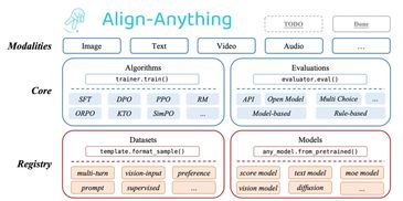 Align-Anything aims to align any modality large models (any-to-any models), including LLMs, VLMs, and others, with human intentions and values. Overall, this framework has the following characteristics: Highly Modular Framework, Support for Various Model Fine-Tuning, Support Fine-Tuning across Any Modality, Support Different Alignment Methods.